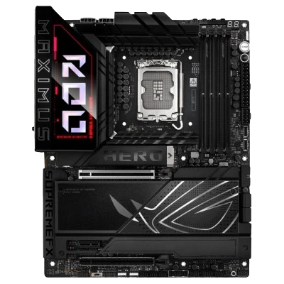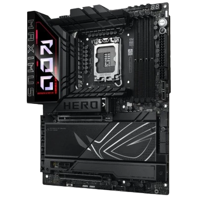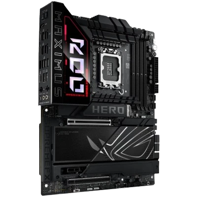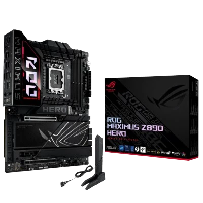 ROG MAXIMUS Z890 HERO Intel® Z890 LGA 1851 ATX motherboard, Advanced AI PC-ready, 22+1+2+2 power stages, NPU Boost, DDR5 slots with NitroPath DRAM Technology, DIMM Flex, AEMP III, WiFi 7 with ASUS WiFi Q-Antenna, three PCIe® 5.0 M.2 slots and three PCIe 4.0 M.2 slots onboard with ROG M.2 PowerBoost, SlimSAS connector, PCIe 5.0 x16 SafeSlot with PCIe Slot Q-Release Slim and full support for next-gen graphics cards, two Thunderbolt™ 4 ports, USB 20Gbps Type-C® front-panel connector with Quick Charge 4+ up to 60W and USB Wattage Watcher, ASUS AI Advisor, AI Overclocking, AI Cooling II, AI Networking II and Polymo Lighting II Ready for Advanced AI PCs: Designed for the future of AI computing, with the power and connectivity needed for demanding AI applications Intel® LGA 1851 Socket: Ready for Intel® Core™ Ultra Processors (Series 2) Exclusive AI Technologies: ASUS AI Advisor, AI Overclocking, AI Cooling II, and AI Networking II to simplify setup and improve performance Advanced Overclocking & Memory Technologies: NPU Boost, NitroPath DRAM Technology, DIMM Fit, DIMM Flex and AEMP III Robust Power Solution: 22(110A)+1(90A)+2(90A)+2(80A) power stages with ProCool II power connectors, MicroFine alloy chokes and premium metallic capacitors Optimized Thermal Design: Massive heatsinks integrated with the I/O cover, joined by a U-shaped heatpipe and connected to the power stages with high-conductivity thermal pads Latest M.2 Support: Three PCIe® 5.0 M.2 slots and three PCIe 4.0 M.2 slots onboard with ROG M.2 PowerBoost, all with substantial cooling solutions Abundant Connectivity: Dual Thunderbolt™ 4 USB Type-C® ports, USB 20Gbps Type-C front-panel connector with Quick Charge 4+ up to 60W and USB Wattage Watcher, USB 10Gbps Type-C front-panel connector, five additional USB 10Gbps ports, PCIe 5.0 x16 SafeSlot with full support for next-gen graphics cards, HDMI™ 2.1 High-Performance Networking: On-board Wi-Fi 7 (802.11be) with ASUS WiFi Q-Antenna, Intel 2.5Gb Ethernet and Realtek 5Gb Ethernet DIY-Friendly Design: PCIe Slot Q-Release Slim, new M.2 Q-Latch, M.2 Q-Release, M.2 Q-Slide, Q-Antenna, BIOS Q-Dashboard, Q-Code, Q-LED, FlexKey button, Start button, BIOS FlashBack™ button, Clear CMOS button and pre-mounted I/O shield Immersive Audio: ROG SupremeFX ALC4082 codec with ESS® ES9219 Quad DAC for up to 32-Bit/384 kHz playback Unmatched Personalization: I/O cover with Polymo Lighting II, three Gen 2 ARGB headers, all configurable with ASUS-exclusive Aura Sync RGB lighting Renowned Software: ASUS DriverHub, Dolby Atmos®, exclusive 1-year Internet Security subscription, TurboV Core, GlideX, HWiNFO, and bundled 1-year AIDA64 Extreme subscription