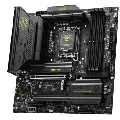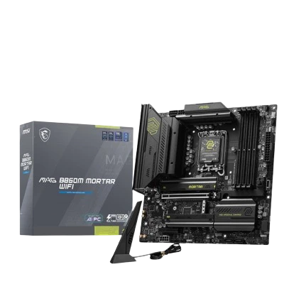 MAG B860M MORTAR WIFI Support Intel® Core™ Ultra Processors (Series 2) for LGA 1851 socket Supports DDR5 Memory, Dual Channel DDR5 9200+ MT/s (OC) Ultra Performance: 12+1+1+1 Duet Rail Power System 60A DrMOS, dual 8-pin CPU power connectors, Core Boost, Memory Boost, 6-layer PCB made by 2oz thickened copper and server-grade level material Frozr Guard: Extended Heatsink, MOSFET thermal pads rated for 7W/mK, additional choke thermal pads and EZ M.2 Shield Frozr II are built for high performance system and non-stop experience EZ DIY: EZ PCIe Release, EZ M.2 Shield Frozr II, EZ M.2 Clip II and EZ Antenna Lightning Fast Game experience: PCIe 5.0 slot, Lightning Gen 5 x4 M.2 Ultra Connect: Thunderbolt™ 4 port, Intel® Killer™ 5G LAN & Intel® Killer™ Wi-Fi 7 Solution - the latest solution for professional and multimedia use, delivering secure, stable, and high-speed networking and data transmission Audio Boost : Reward your ears with studio grade sound quality for the most immersive gaming experience