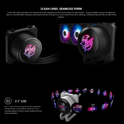 The new generation full-plane copper base eliminates the traditional screw perforation design, significantly enhancing water-tightness and ensuring more reliable system operation. Equipped with a precise 0.1mm micro-channel design, it efficiently absorbs CPU heat and works in tandem with the high-performance pump to quickly dissipate heat, delivering exceptional cooling performance.