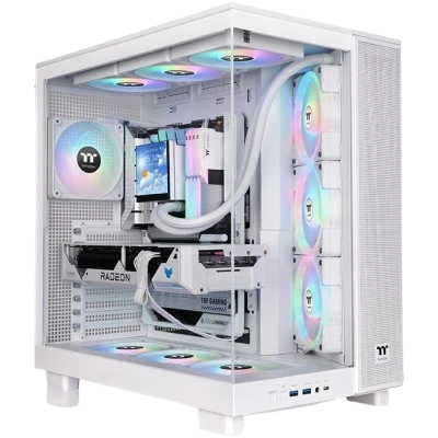 The View 380 XL TG ARGB Snow Mid Tower Chassis is a dual-chamber ATX case with Hidden-Connector Motherboard support, four 120mm Hydraulic Bearing ARGB Lite fans, and space for a 360mm radiator at both the top and motherboard side. It supports up to ten 120mm fans and features a built-in GPU holder, front I/O ports, a recessed bottom compartment, and an angled motherboard side design, offering users enhanced flexibility for their ideal build.