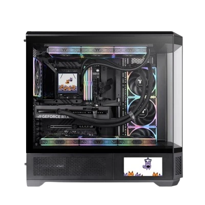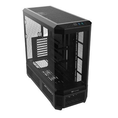 The View 600 TG Full Tower Chassis is an E-ATX case with four tempered glass panels, rotational PCI-E slots, a built-in GPU bracket, and supports up to ten 120/140mm fans and 360mm/420mm radiators. An optional 6" LCD Panel Kit is available for enhanced visuals.